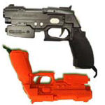 Mein erstes Spiel mit dem ich den Nachfolger der legendären G-Con 45 ausprobierte, war Time Crisis 2. Auf diese Art konnte ich mir erstmals einen guten Eindruck machen, von der Anordnung der Knöpfe, sowie der Präzision und der Handhabung. Nach mehreren anderen Titeln und etlichen Stunden Spielzeit hier nun mein Fazit (das ich aber wahrscheinlich auch schon nach der besagten ersten Runde Time Crisis 2 ziehen hätte können): Die G-Con 2 ist in allen wichtigen Bereichen ihren Konkurrent meilenweit voraus! ![]() Andere Länder, andere Knarren: in Kalifornien ballert ihr in grellem orange, in Japan in edlem schwarz! Neben dem A und B-Knopf finden sich an der Gun noch ein Start sowie ein Select Button. Dann wäre da noch das Steuerkreuz oberhalb des Griffes am Ende des Laufs, das sich sehr bequem mit dem Daumen bedienen lässt. Besonders das Navigieren in den Auswahlmenüs erleichtert ihr euch damit erheblich. Abgerundet wird die Buttonvielfalt von einem Knopf am unteren Ende des Griffs (den C-Button), also dort wo bei einer normalen Waffe das Magazin eingesetzt wird. Und so wird dieser auch in einigen Spielen verwendet! Beispielsweise bei Virtua Cop - Elite Edition könnt ihr euch das Wegzielen vom Bildschirm zum Nachladen sparen. Ihr drückt einfach auf diesen Knopf und schon geht's weiter! Auch das hat sich beim Probspielen sehr bewährt und vermittelt zudem ein ganz anderes Spielgefühl. Nicht zu vergessen, dass ihr dadurch einen geringen Geschwindigkeitsvorteil habt. Zur Präzision muss ich eigentlich nicht mehr schreiben als ich nicht oben schon getan hab. Sie ist über alle Zweifel erhaben, nach dem obligatorischen Kalibrieren am Anfang jeden Spiels, trefft ihr alles (und wenn nicht dann liegt es an euch und nicht an der Lightgun). Leider kann man die G-Con 2 nur für die Playstation 2 verwenden, denn es ist von Haus aus nur ein USB-Stecker mit der Waffe verkabelt. Normalerweise ist im Lieferumfang auch noch ein separates Videokabel, mit dem ihr zwei Lightguns an euren Fernseher anschließen könnt. Das Kabel an der Gun selbst ist mit seinen rund 2 Metern auch für Leute geeignet, die gerne etwas weiter weg sitzen. So, hab ich noch was vergessen? Na ja, falls ihr es bis hierher noch nicht gemerkt habt so möchte ich es an dieser Stelle nochmals sagen: Solltet ihr nach einer Lightgun für die PS2 Ausschau halten, dann besorgt euch dieses gute Stück! Die Gun gibt es auch wieder in diversen Bundles mit Namco Spielen, die da wären: